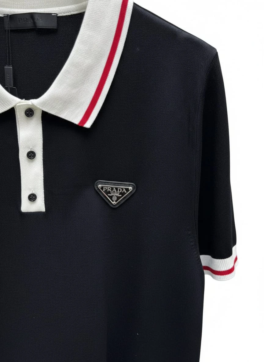 Crafted from high-quality breathable cotton, it ensures all-day comfort. The knitted white collar with contrasting red stripes adds a sharp, contemporary touch. The iconic Prada metal triangle logo on the chest enhances its premium identity.