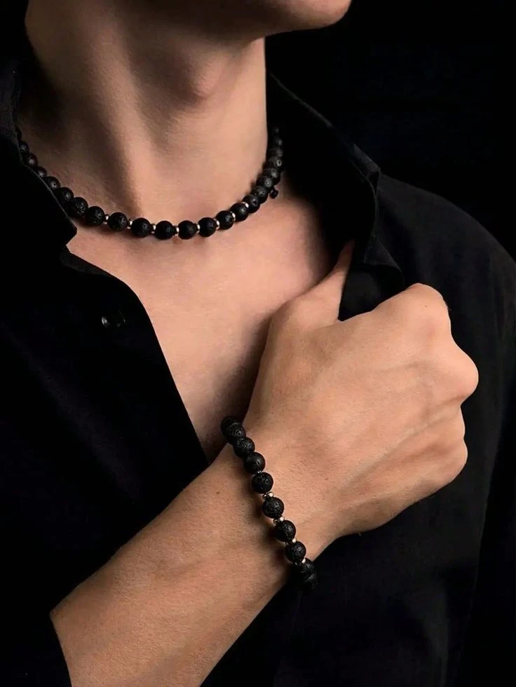 طقم رجالي حجر الافا البركاني بيمتص الزيوت العطريه مع فواصل الهيماتيت بيتعامل معامله الدهب والفضه حجم الحبايا ٨مللي
