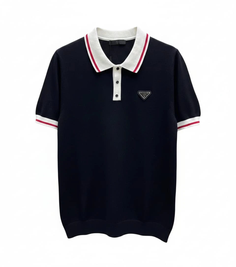 Crafted from high-quality breathable cotton, it ensures all-day comfort. The knitted white collar with contrasting red stripes adds a sharp, contemporary touch. The iconic Prada metal triangle logo on the chest enhances its premium identity.