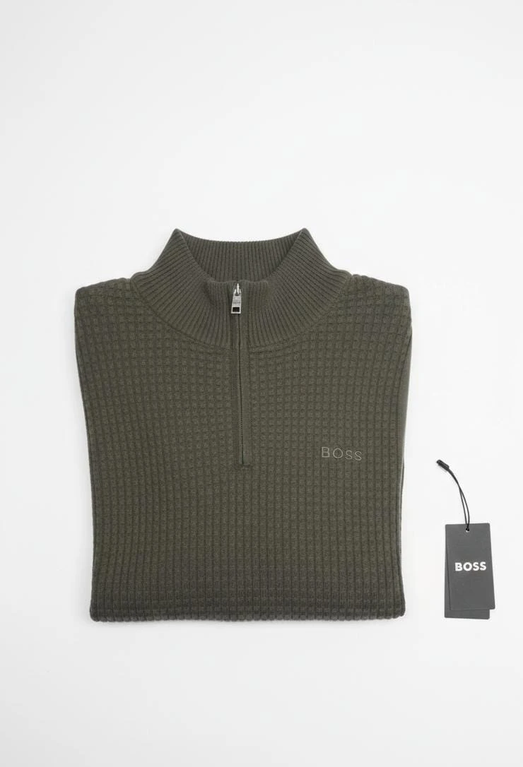 Elevate your look with this olive half-zip sweater, designed to combine practicality and contemporary style. The high collar with a half-zip closure offers adjustable comfort and a refined appearance suitable for various occasions.